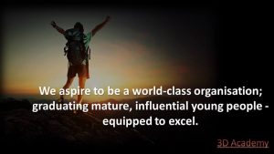 • We aspire to be a world-class organisation; graduating mature, influential young people – equipped to excel.